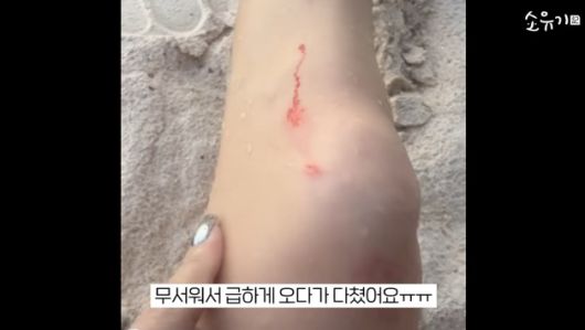 하지만 소유는 "무서워서 급하게 오다가 다쳤다. 다들 바다 수영할때는 항상 조심!"이라며 상처가 난 다리를 공개했다. 그는 "여기는 이렇게 됐다. 영광의 상처"라고 너스레를 떨었다.