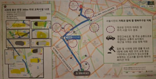 문제는 4번 출구 근처에 어린이집, 초등학교 5곳, 중고등학교 4곳 등 교육시설이 밀집돼 있다는 점이다. 서울형키즈카페, 청소년문화공간 등까지 합하면 시위대 동선 반경 300m 이내 교육시설은 12곳에 달한다는 설명이다.