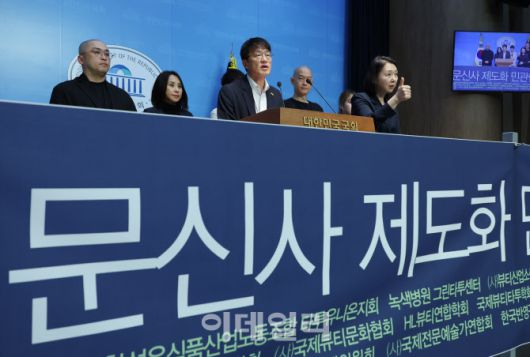 박주민 국회 보건복지위원장과 문신사제도화 민관협의회 TFT 회원들이 지난 8월 서울 여의도 국회 소통관에서 문신사법 제정 촉구 기자회견을 하고 있다.(사진=뉴시스) |