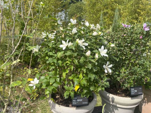 일반 무궁화는 약 2m 이상 자라지만, 키즈 화이트는 0.5~1m로 키가 작아 정원뿐 아니라 베란다·실내에서도 잘 자라 활용도가 높다. 흰 꽃이 풍성하게 피어 실내외 어디서나 감상하기 좋다.