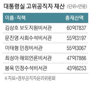 이번 재산 공개 대상자 중 현직으로는 김상호 대통령비서실 보도지원비서관이 60억7837만원을 신고해 가장 재산이 많았다. 김 비서관은 본인과 배우자 공동 명의로 서울 대치동 다세대주택과 서울 광진구 구의동 신원빌라트 등 서울 시내에 2주택을 보유했다고 신고했다.