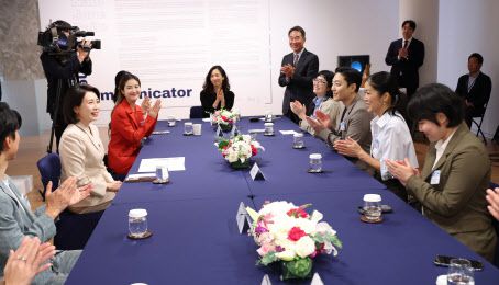 이재명 대통령과 미국을 방문 중인 김혜경 여사가 25일(현지시간) 뉴욕한국문화원에서 차세대 예술가 간담회를 하고 있다. (사진=연합뉴스) |
