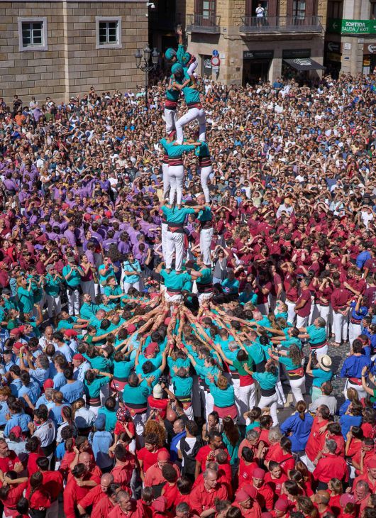 24일 스페인 2대 도시 바르셀로나의 한 광장에서 열린 ‘라메르세’ 축제에서 주민들이 인간 탑을 쌓고 있다. ‘라메르세’는 바르셀로나의 수호 성인인 성모 마리아를 기리는 행사다. 수많은 시민들이 인간 탑을 쌓는 이 행사는 2010년 유네스코 세계무형문화유산에 등재됐다.