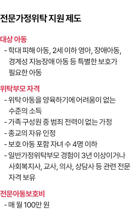 올해 전문위탁 대상 아동은 500명인데, 이 중 29.8%(149명)는 6월 기준 전문위탁가정에서 돌보지 못하고 있다. 일부 아직 심사 중인 아동도 있지만, 전문가정위탁에 대한 지원은 현실적으로 부족한데 요건은 까다로워서 위탁부모 자체를 찾기가 쉽지 않아서다. 전문가정위탁은 의료인, 교사, 사회복지사 등 전문 자격증을 소지한 사람 또는 3년 이상 일반가정위탁 경험이 있는 경우만 지원할 수 있다. 전문위탁부모를 찾지 못하면, 특별한 보호가 필요한 아이들이 일반가정위탁으로 맡겨질 수밖에 없다. 일반가정위탁은 보호비 지원도 한 달 30만~50만 원 수준(지자체별로 상이)에 불과하다.