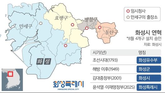 화성유수부(1793년), 화성군(1949년)을 거쳐 화성시(2001년)로 승격한 화성은 2023년 12월 인구 100만을 넘어섰다. 이어 2년 연속 인구 100만명을 유지하면서 올해 1월1일에는 특례시 지위를 부여받았다. 2010년 인구 50만을 넘겨 일반구(區) 설치 기준을 충족한 뒤 15년 만인 지난달에는 만세·효행·병점·동탄구 설치를 정부로부터 최종 승인받았다.