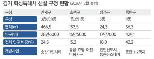 화성시는 내년 2월 △만세구(28만6000여명·전체 인구의 24.5%) △효행구(16만5000여명·15.2%) △병점구(17만7000여명·18.0%) △동탄구(42만여명·42.2%) 체제를 갖추게 된다. 시는 그동안 연구용역과 정책투표, 여론조사 등을 거쳐 구청별로 특화된 발전계획과 행정서비스를 준비해 왔다. 임시청사 마련 등을 거쳐 생활권 내 30분 안에서 세무, 인·허가, 복지, 민원 등 주요 행정업무 처리가 가능하도록 만들 계획이다.