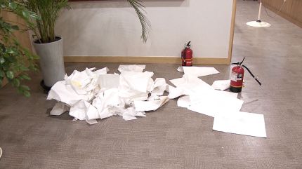 출입문이 활짝 열려 있고, 소화기와 기름을 닦은 흡착포들이 바닥에 널브러져 있습니다.