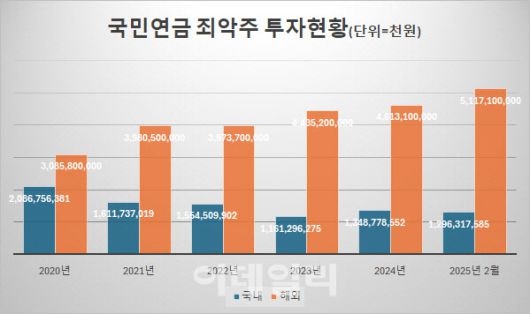 죄악주에 대한 국내주식 투자의 경우 △2020년 2조 867억원으로 최고점을 찍은 뒤 △2023년 1조 1612억원까지 투자 규모가 줄었다가 △2025년 2월 기준 1조 2963억원으로 증가했다. 해외주식 투자의 경우 △2020년 3조 858억원에서 △2025년 2월 5조 1171억원으로 대폭 증가했다.