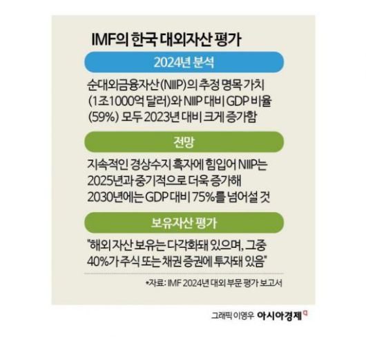IMF는 우리나라의 순대외자산이 지속적인 경상수지 흑자를 바탕으로 더욱 확대될 것으로 내다봤다. 2030년에는 GDP 대비 75%를 넘어설 것으로 전망했다. 대규모의 순대외자산의 보유 구조도 다각화돼 있다고 평가했다. IMF는 "해외자산은 주식·채권 증권투자가 약 40%, 달러화 표시 자산이 약 60%를 차지해 해외 자산 보유가 다각화돼 있다"고 했다.
