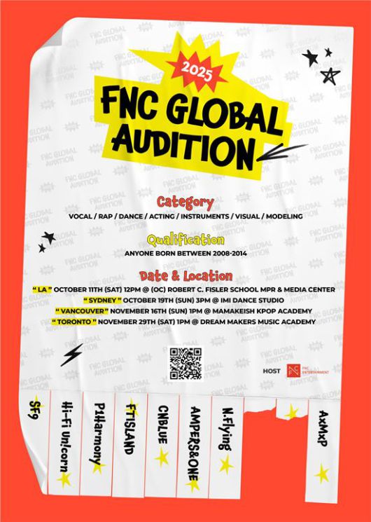 ‘2025 FNC 글로벌 오디션’은 오는 10월 11일 로스앤젤레스를 시작으로 10월 19일 시드니, 11월 16일 밴쿠버, 11월 29일 토론토에서 개최된다.