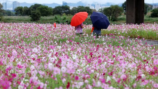 25일 오후 전남 나주시 영산강 둔치에서 시민들이 코스모스가 핀 산책길을 걷고 있다. 연합뉴스 |