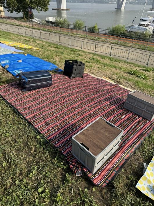공개된 사진에는 강변에 색색의 돗자리 수십개가 일렬로 깔려 있었고, 돗자리 위에 여행가방과 플라스틱 박스 등이 놓여 있었다. 글쓴이는 “하루 전 아침 일찍인데도 사람은 없고 짐만 있다”고 전했다.