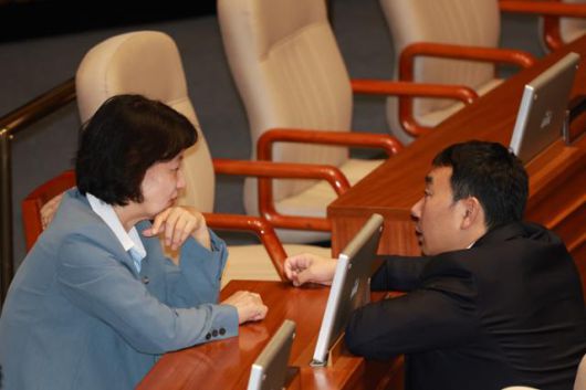 국회 법제사법위원회의 김용민(오른쪽) 더불어민주당 간사와 추미애 법사위원장이 25일 서울 여의도 국회에서 열린 제429회 국회(정기회) 제9차 본회의 시작에 앞서 대화하고 있다. 뉴시스 |