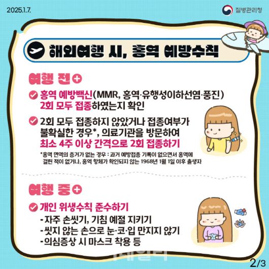 26일 질병관리청 등에 따르면 여행 전 예방접종이 권장되는 백신은 MMR(홍역) 폴리오(소아마비) 등 기초 백신이다. 대부분 어릴 때 접종이 완료된 상태로 일부 고령자를 제외하면, 기초 백신 미접종자는 사실상 드물다. 다만, MMR 백신은 2회 접종했는지 확인하고 여행을 떠나는 것이 좋다.