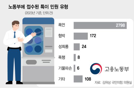특히 노동부 직원을 대상으로 하는 악성 민원은 심각한 수준이다. 폭언이나 폭행, 반복 민원으로 직원에게 피해를 주는 ‘특이 민원’은 2023년 3116건으로 2022년과 비교해 약 28% 증가했다. 한 민원인이 2019년부터 2023년까지 5년간 무려 3245건의 특이 민원을 제기한 사례도 있었다.