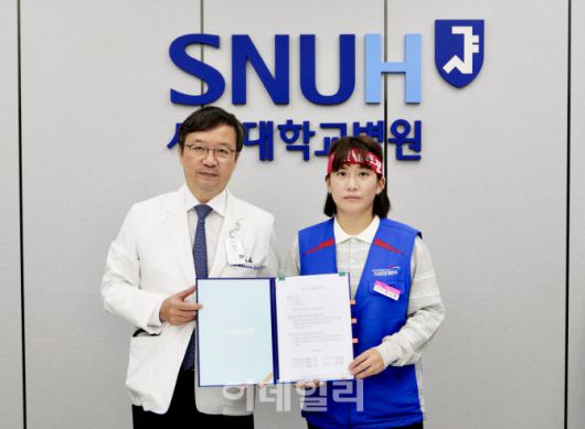 서울대병원과 노조 측은 26일 원내에서 ‘2025년 임금 및 단체협약 가조인식’을 진행했다. 김영태 서울대병원장(왼쪽)과 박나래 서울대병원분회장.(사진=서울대병원) |