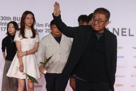 장률 감독이 26일 부산 해운대구 우동 영화의전당에서 열린 제30회 부산국제영화제 폐막식 레드카펫에서 관객들에게 인사하고 있다./연합뉴스 |