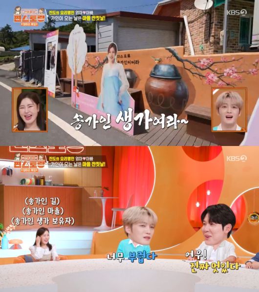 이날 송가인은 부모님이 있는 고향 진도를 찾았다. 송가인 공원, 송가인 길, 송가인 마을 등이 있을 정도로 진도의 명물이 된 송가인. 특히 송가인은 부모님이 사는 일명 ‘송가인 생가’에 대해 “나는 살아있는데 생가가 돼버렸다”며 민망한 웃음을 지었다.