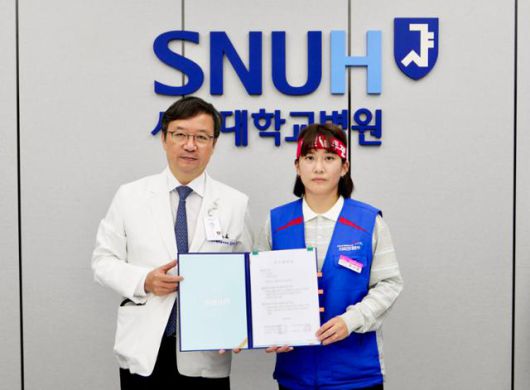 서울대병원과 공공운수노조 의료연대본부 서울대병원 분회가 26일 2025년 임금 및 단체협약에 잠정 합의한 가운데 김영태(왼쪽) 서울대병원장과 박나래 분회장이 기념 촬영을 하고 있다. 서울대병원 제공 |