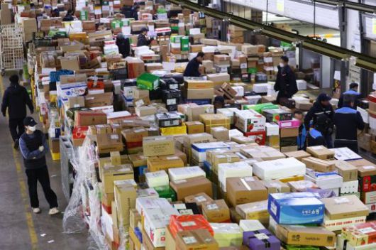 설 명절을 앞둔 21일 오전 서울 광진구 동서울우편물류센터에 택배가 쌓여있다. 연합뉴스 |