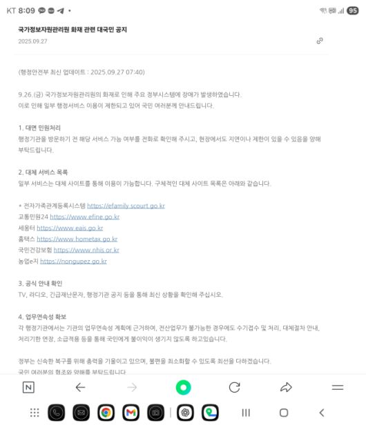 또한 행정안전부는 TV, 라디오, 긴급재난문자, 행정기관 공지 등을 통해 최신 상황을 확인해 줄 것을 요청했다. 아울러 각 행정기관은 업무연속성 계획에 따라 전산업무가 불가능할 경우 수기 접수·처리, 대체절차 안내, 처리기한 연장, 소급적용 등을 시행해 국민 불이익이 발생하지 않도록 하고 있다고 설명했다.
