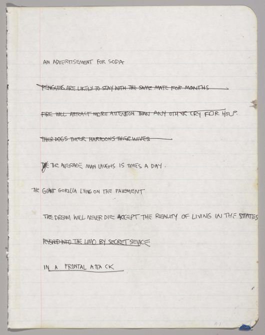 탄산음료 광고. 평범한 사람은 하루에 15번 웃는다. 포장도로에 누워 있는 거대한 고릴라. 꿈은 결코 무너지지 않는다 미국에서 살아간다는 현실을 받아들여라. 공허하고 비참하다 곪아 터져 벌어진 상처 같은 인생. 너무 뻔한 삐뚤어진 이상한/엉뚱한©. 아트. 길거리 산책. 먹는 행위 접시 위 음식을 우아하게 차려내는 행위 허상.
