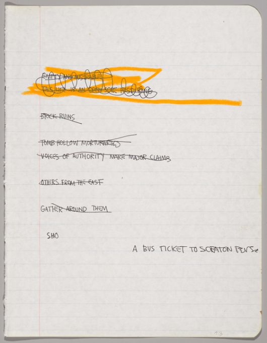 미국의 국민 공책이라 불리는, 평범한 컴포지션(composition) 노트북에는 바스키아가 직접 작업한 온갖 메모와 시구, 드로잉이 뒤섞여 있다. 날짜가 없으니 일기는 아니고, 알파벳 대문자로 반듯 반듯하게(심지어 꽤 잘 쓴 글씨체로) 적은 문장들이니 낙서라 할 수도 없고, 드로잉보다는 글자가 더 많으니 스케치북도 아니다.