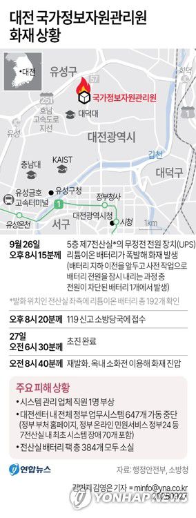 (서울=연합뉴스) 양정우 기자 = 전날인 26일 국가정보자원관리원(국정자원) 대전 본원에 있는 전산실에서 발생한 화재로 정부 업무시스템 647개가 가동이 중단된 것으로 파악됐다.