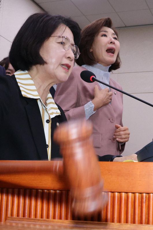 나경원 국민의힘 의원이 22일 서울 여의도 국회 법제사법위원회에서 열린 검찰개혁 입법청문회에서 퇴장 명령을 한 추미애 위원장에게 항의하고 있다. 2025.9.22/뉴스1 |
