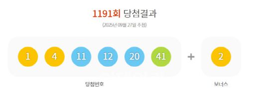 [이데일리 한전진 기자] 로또복권 운영사 동행복권은 27일 제1191회 로또 추첨 결과 1등 당첨번호가 ‘1·4·11·12·20·41’라고 밝혔다. 보너스 번호는 ‘2’이다. (사진=동행복권)