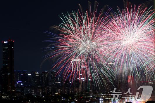 27일 오후 서울 여의도 한강공원 일대에서 열린 '2025 서울세계불꽃축제'에서 화려한 불꽃이 밤하늘을 수놓고 있다. ⓒ News1 베이징 공동취재단,황기선 기자 |