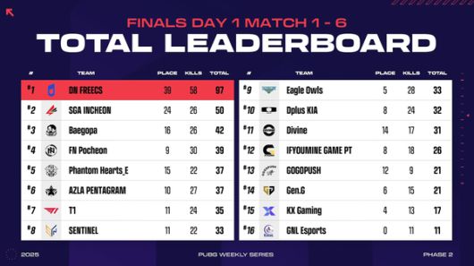 DN 프릭스는 이날 열린 6개 매치에서 치킨 2회 및 순위 포인트 39점, 킬 포인트 58점을 획득하며 토털 포인트 점으로 파이널 선두에 올랐다. 2위 SGA 인천(50점)와의 점수 격차는 무려 47점에 이른다.