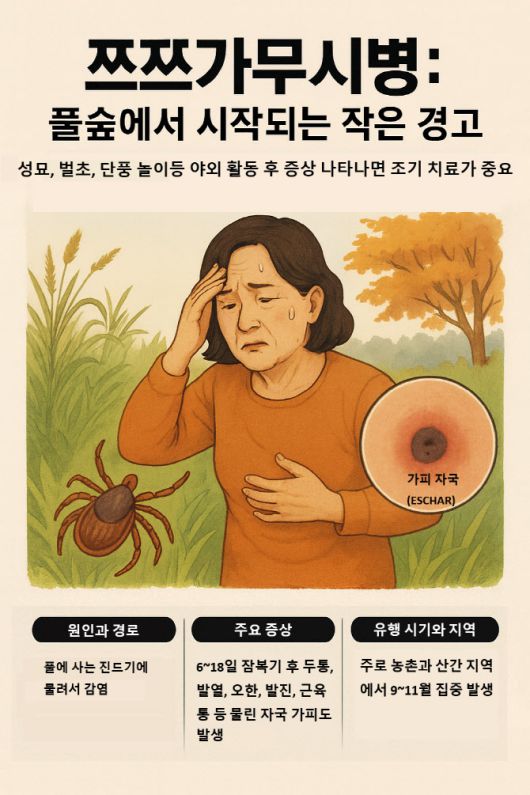 쯔쯔가무시병은 작은 벌레가 옮기는 질병이지만, 그 결과는 결코 작지 않다. 비교적 간단한 치료로 회복이 가능하지만, 조기 진단과 예방이 뒷받침되지 않으면 심각한 결과를 초래할 수 있다. 단풍이 물들고 야외활동이 늘어나는 계절, 건강을 위협하는 보이지 않는 작은 벌레를 경계하며 예방의식을 갖는 것이 우리 모두의 안전을 지키는 길이다.