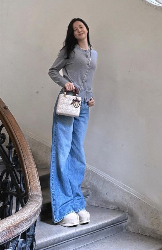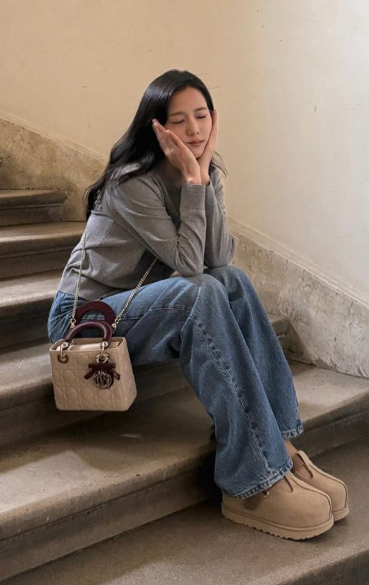 공개한 사진에서 지수는 연한 그레이 카디건에 와이드 레그 데님을 매치해 포근하면서도 시크한 가을 룩을 완성했다. 부다페스트의 클래식한 건축물 계단을 배경으로, 소프트 그런지 메이크업과 자연스러운 포즈가 어우러져 청순하면서도 고급스러운 무드를 자아낸다.