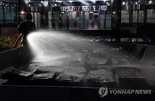 불에 탄 리튬이온 배터리에 물 뿌리는 소방대원 |