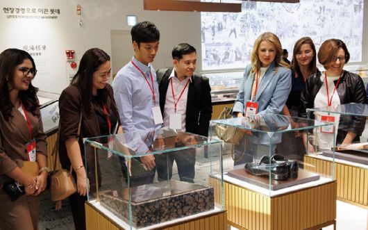 롯데 글로벌 컨퍼런스 참가자들이 롯데월드타워 위치한 신격호 롯데 창업주 기념관을 방문해 실물 자료를 살펴보고 있다. [사진=롯데] |