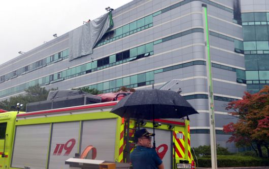 대전 국가정보자원관리원 화재로 초비상이 걸린 28일 화재 현장에서 관계자들이 파손된 유리창을 방수포로 덮고있다. 김성태 객원기자 |