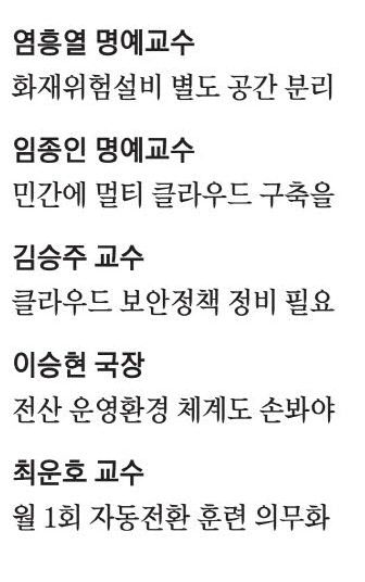 실패를 위한 훈련의 정례화가 필요하다는 조언도 나왔다. 서강대 메타버스혁신센터장인 최운호 교수는 "모든 백업과 재해복구 시스템은 월 1회 이상 실제 상황과 동일한 조건에서 예고 없는 '자동 전환 훈련'을 의무화해야 한다"고 강조했다. 최 교수는 "훈련을 통해 문제점을 찾아내지 못하는 시스템은 실제 상황에서도 작동하지 않기 때문에 이 같은 훈련을 실시해 사고 대응 역량을 키우는 것이 중요하다"고 말했다.