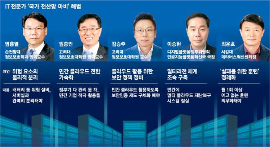민간 클라우드 서비스를 적극 활용해야 한다는 주장도 나왔다. 국가 기밀 정보는 국가가 직접 관리하지만 민원 서비스는 민간 클라우드의 멀티(다중)리전을 활용하는 방안이 대표적이다. 임종인 고려대 정보보호대학원 명예교수는 "카카오 사태 때와 마찬가지로 이번에도 시스템 이중화가 없어 자동 전환되지 않았다"며 "미국은 이미 민간 클라우드와 인공지능(AI)을 접목해 회복력을 높이고 있는 만큼 한국도 민간 혁신을 과감히 개방해 자동 전환과 분산을 확보해야 한다"고 강조했다. 이 국장도 "국정자원도 하나의 클라우드 서비스 제공자(CSP)로 재정의하고 민간 클라우드에 정부 '전용 존'을 만들어 멀티 클라우드와 멀티리전 재난복구 시스템을 갖춰야 한다"고 제언했다.