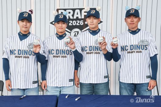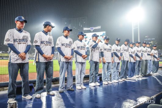 지난 24일 창원NC파크에서 열린 2025 신한 SOL 뱅크 KBO리그 정규시즌 LG 트윈스와의 홈경기를 앞두고 이번 2026 신인드래프트에서 NC의 지명을 받은 13명의 신인 선수가 팬들 앞에 모습을 드러냈다.