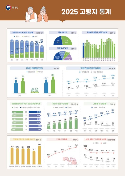 26일 통계청이 발표한 '2025 고령자 통계'에 따르면 올해 우리나라 65세 이상 인구는 1051만 4000명으로 전체 인구의 20.3%를 차지했다.