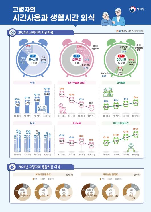 이날 통계청이 특별기획으로 함께 내놓은 '고령자의 시간사용과 생활시간 의식'을 보면 지난해 기준 고령자는 하루에 수면, 식사, 건강관리 등 필수시간에 11시간 59분을 할애했다. 일, 학습 등 의무시간은 4시간 58분, 여가시간은 7시간 3분을 각각 사용했다.