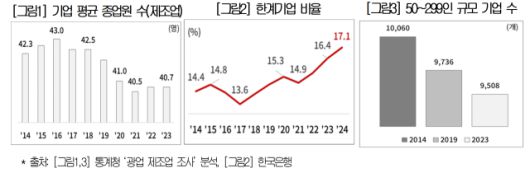 보고서는 이에 대한 근거로 △기업 당 평균 종업원수 감소 △한계기업 비중 역대 최대 △중간허리 기업의 감소 등을 꼽았다. 실제로 기업 당 평균 종업원 수는 2016년 43명에서 2023년 40명대 수준으로 내려앉았다. 공장 자동화 등 영향도 있지만 본질적으로 중소기업의 대기업으로 성장이 활발하게 이뤄지지 못하고 소규모 기업만 계속 늘어난 결과라는 설명이다.