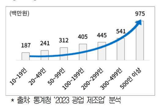 아울러 대기업으로 성장할 수 있는 규모있는 중소기업과 중견기업이 감소하고 있는 것도 원인 중 하나다. 종업원수 50~299인 규모의 기업은 2014년 10,060개에서 2019년 9,736개, 2023년 9,508개로 지속 감소 중이다. 중소기업이 중견기업으로 성장하면 각종 지원 혜택은 사라지고 규제는 늘어남에 따라 중간허리 기업이 버티지 못하고 도태되고 있다고 분석했다.