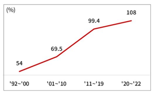우리나라의 총요소생산성 증가율은 OECD 주요국 대비 가파르게 감소하고 있다. 한국은 2016년~2018년 평균 2.1%에서 2020~2022년 평균 0.9%로 1.2%포인트 하락했지만 OECD 24개국 평균은 같은 기간 0.5%에서 1.7%로 1.2%포인트 상승했다. 아울러 제조업 내 자원배분 비효율성도 1990년대 평균 54%에서 2000년대 평균 69.5%, 2010년대 99.4%로 상승한 데 이어, 최근(2020~2022)년에는 108%까지 치솟았다.