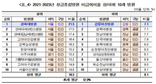 3개년 비급여율 평균이 가장 높은 곳은 경희대병원으로 21.5%였다. 가장 낮은 곳은 강릉아산병원으로 7.1%로, 경희대병원의 3분의 1 수준이었다.