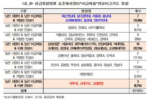 또 개별 병원의 질병군별 건당 진료비를 환자 분류 체계를 감안한 동일 평가군과 비교한 '진료비 고가도지표'를 분석한 결과 상급종합병원 평균인 0.999를 초과해 '상대적으로 비싼 진료'를 한다고 평가된 곳은 원광대병원 등 22곳이었다. 평균보다 낮아 '상대적으로 저렴한 진료'를 한다고 평가된 곳은 서울성모병원 등 22곳이었다.