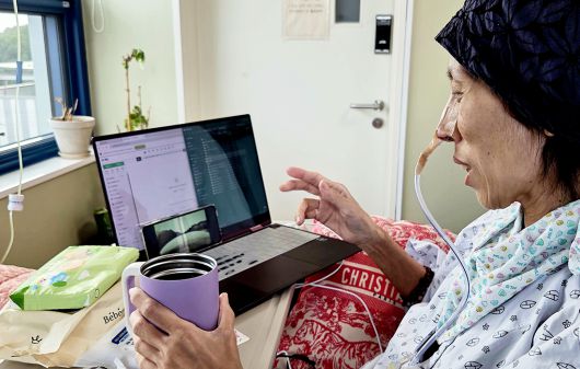 유고운씨가 지난 23일 경기 고양시 국립암센터 병실에서 노트북을 열어 자료를 보고 있다. |