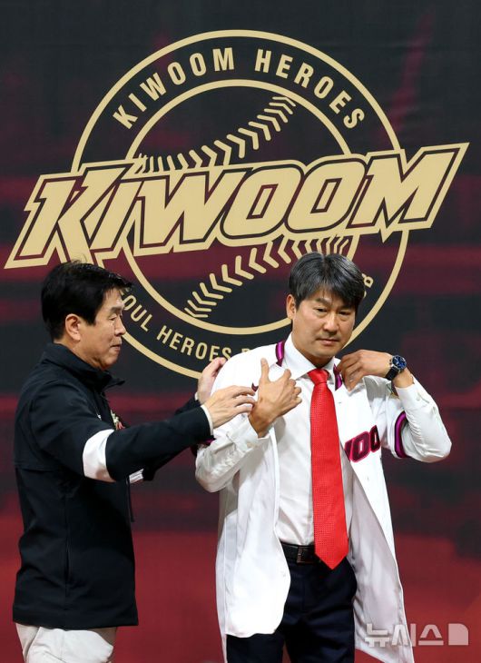 [서울=뉴시스] 박주성 기자 = 29일 오후 서울 구로구 고척스카이돔에서 열린 키움히어로즈 제7대 설종진 감독 취임식에서 설 감독이 위재민 키움히어로즈 대표이사로부터 유니폼을 전달 받고 있다. 2025.09.29. park7691@newsis.com |