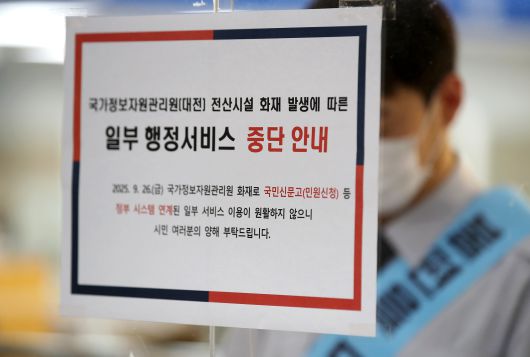 29일 오전 대구 중구청 종합민원실에 국가정보자원관리원 대전 본원에서 발생한 화재로 일부 행정서비스가 중단됐다는 안내문이 붙어 있다./뉴스1 |